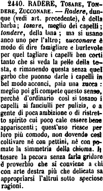 | Radere, Tosare, Tondere, Zucconare - Radere, dunque (vedi art. precedente), è della barba; tosare, meglio dei capelli; tondere, della lana; ma si usano anco uno per l'altro; zucconare è modo di dire famigliare e burlevole per quel tagliare i capelli ben corti tanto che si veda la pelle della testa, e rimanendo questa senza quel garbo che puonno darle i capelli in bel modo acconci, paia una zucca: meglio poi gli compete questo senso, perchè d'ordinario così si tosano i capelli ai fanciulli per pulizia, o a gente di poca ambizione o di ristretto spirito cui poco cale essere bene appariscenti; quest'uso riesce per loro più comodo, non dovendo così coltivare nè con pettini, nè con pomate la simmetria della chioma. Il tosare la pecora senza farla gridare è proverbio che si conviene a chi con arte destra più che delicata sa appropriarsi l'altrui sotto speciose ragioni. [immagine] |