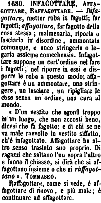 Raffagottare, come si vede, è affagottare di nuovo, e più male; è continuare ad affagottare. [immagine] |