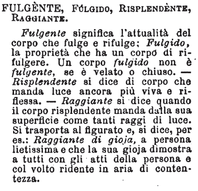 | Fulgente, Fulgido, Risplendente, Raggiante - Fulgente significa l'attualità del corpo che fulge e rifulge; Fulgido, la proprietà che ha un corpo di rifulgere. Un corpo fulgido non è fulgente, se è velato o chiuso. - Risplendente si dice di corpo che manda luce ancora più viva e riflessa. - Raggiante si dice quando il corpo risplendente manda dalla sua superficie come tanti raggi di luce. Si trasporta al figurato e, si dice, per es.: Raggiante di gioja, a persona lietissima e che la sua gioia dimostra a tutti con gli atti della persona e col volto ridente in aria di contentezza. [immagine] |