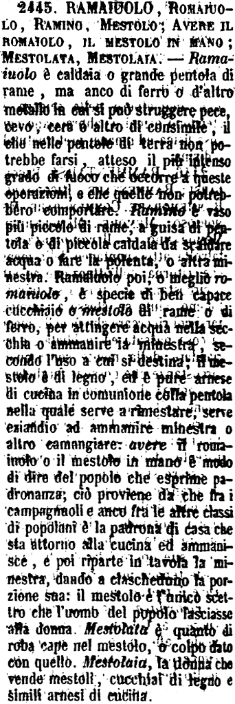 Ramaiuolo, Romaiuolo, Ramino, Mestolo; Avere il romaiolo, Il mestolo in mano, Mestolata, Mestolaia - Ramaiuolo è caldaia o grande pentola di rame, ma anco di ferro o d'altro metallo in cui si può struggere pece, cevo, cera o altro di consimile, il che nelle pentole di terra non potrebbe farsi, atteso il più intenso grado di fuoco che occorre a queste operazioni, e che quelle non potrebbero comportare. Ramino è vaso più piccolo di rame, a guisa di pentola o di piccola caldaia da scaldare acqua o fare la polenta, o altra minestra. Ramaiuolo poi, o meglio romaiuolo, è specie di ben capace cucchiaio o mestolo di rame o di ferro, per attingere acqua nella secchia o ammanire la minestra, secondo l'uso a cui si destina; il mestolo è di legno, ed è pure arnese di cucina in comunione colla pentola nella quale serve a rimestare, serve eziandio ad ammanire minestra o altro camangiare: