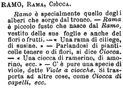 | Ramo, Rama, Ciocca - Ramo è specialmente quello degli alberi che sorge dal tronco. - Rama è piccolo fusto che nasce dal Ramo, vestito dalle sue foglie e anche dei fiori o frutti. - «Una rama di ciliege, di susine.» - Parlandosi di pianticelle tenere o di fiori, si dice Ciocca. - «Una ciocca di ramerino, di amorino, ecc.» - C'è pure una specie di viole, dette Viole a ciocche. Si trasporta ad altre cose, come Ciocca di capelli, ecc. [immagine] |