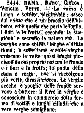 | Rama, Ramo, Ciocca, Verghe, Vette - La rama è lunga e sottile, pieghevole; nasce dal ramo che è un braccio dell'albero; ed è quella che porta le foglie, i fiori e le frutta, secondo la stagione e secondo la natura sua. Le verghe sono sottili, lunghe e dritte rame; e sulle rame e sulle verghe crescono le vette quasi lunghi picciuoli da cui proprio nascon le fronde e i fiori e le frutta; la punta della rama o verga, ove si raccolgono più vette, dirassi ciocca. Le verghe secche e spoglie delle fronde servono a battere: il ferro in verghe è conosciuto in commercio sotto forma di sottili e lunghi cilindri che a vere verghe somigliano. [immagine] |