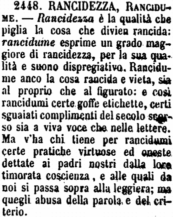 | Rancidezza, Rancidume - Rancidezza è la qualità che piglia la cosa che divien rancida: rancidume esprime un grado maggiore di rancidezza, per la sua qualità e suono dispregiativo. Rancidume anco la cosa rancida e vieta, sia al proprio che al figurato: e così rancidumi certe goffe etichette, certi sguaiati complimenti del secolo scorso sia a viva voce che nelle lettere. Ma v'ha chi tiene per rancidumi certe pratiche virtuose ed oneste dettate ai padri nostri dalla loro timorata coscienza, e alle quali da noi si passa sopra alla leggiera; ma quegli abusa della parola e del criterio. [immagine] |
