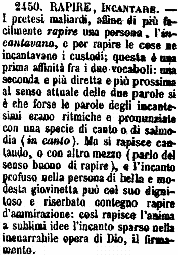 | Rapire, Incantare - I pretesi maliardi, affine di più facilmente rapire una persona, l'incantavano, e per rapire le cose ne incantavano i custodi; questa è una prima affinità fra i due vocaboli: una seconda e più diretta e più prossima al senso attuale delle due parole si è che forse le parole degli incantesimi erano ritmiche e pronunziate con una specie di canto o di salmodia (in canto). Ma si rapisce cantando, o con altro mezzo (parlo del senso buono di rapire), e l'incanto profuso nella persona di bella e modesta giovinetta può col suo dignitoso e riserbato contegno rapire d'ammirazione: così rapisce l'anima a sublimi idee l'incanto sparso nella inenarrabile opera di Dio, il firmamento. [immagine] |