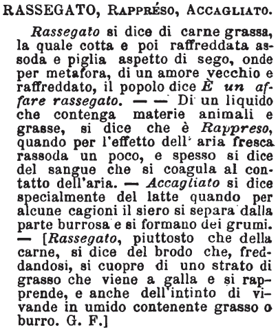 | Rassegato, Rappreso, Accagliato - Rassegato si dice di carne grassa, la quale cotta e poi raffreddata assoda e piglia aspetto di sego, onde per metafora, di un amore vecchio e raffreddato, il popolo dice È un affare rassegato. - - Di un liquido che contenga materie animali e grasse, si dice che è Rappreso, quando per l’effetto dell’aria fresca rassoda un poco, e spesso si dice del sangue che si coagula al contatto dell’aria. - Accagliato si dice specialmente del latte quando per alcune cagioni il siero si separa dalla parte burrosa e si formano dei grumi. – [Rassegato, piuttosto che della carne, si dice del brodo che, freddandosi, si cuopre di uno strato di grasso che viene a galla e si rapprende, e anche dell’intinto di vivande in umido contenente grasso o burro. G. F.] [immagine] |