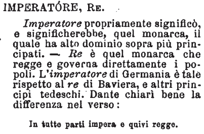 | Imperatore, Re - Imperatore propriamente significò, e significherebbe, quel monarca, il quale ha alto dominio sopra più principati. - Re è quel monarca che regge e governa direttamente i popoli. L'imperatore di Germania è tale rispetto al re di Baviera, e altri principi tedeschi. Dante chiarì bene la differenza nel verso:
