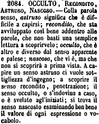 | Occulto, Recondito, Astruso, Nascoso - Colla parola senso, astruso significa che è difficile a capirsi; recondito, che sta avviluppato così bene addentro alle parole, che non basti una semplice lettura a scoprirvelo; occulto, che è altro e diverso dal senso apparente e palese; nascoso, che vi è, ma che non si scoprirà a prima vista. A capire un senso astruso ci vuole sottigliezza d'ingegno; a scoprire il senso recondito, penetrazione; il senso occulto, o s'indovina a caso, o è svelato agl'iniziati; si trova il senso nascosto esaminando ben bene il valore di ogni espressione o vocabolo. [immagine] |