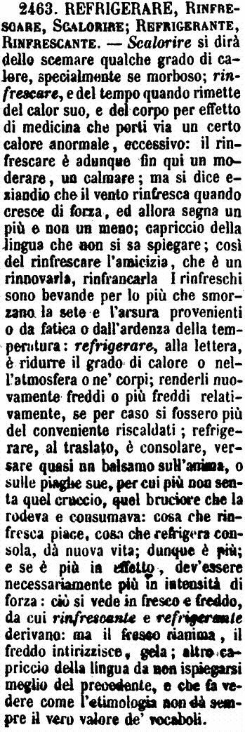 | Refrigerare, Rinfrescare, Scalorire; Refrigerante, Rinfrescante - Scalorire si dirà dello scemare qualche grado di calore, specialmente se morboso; rinfrescare, e del tempo quando rimette del calor suo, e del corpo per effetto di medicina che porti via un certo calore anormale, eccessivo: il rinfrescare è adunque fin qui un moderare, un calmare; ma si dice eziandio che il vento rinfresca quando cresce di forza, ed allora segna un più e non un meno; capriccio della lingua che non si sa spiegare; così del rinfrescare l'amicizia, che è un rinnovarla, rinfrancarla. I rinfreschi sono bevande per lo più che smorzano la sete e l'arsura provenienti o da fatica o dall'ardenza della temperatura: refrigerare, alla lettera, è ridurre il grado di calore o nell'atmosfera o ne' corpi; renderli nuovamente freddi o più freddi relativamente, se per caso si fossero più del conveniente riscaldati; refrigerare, al traslato, è consolare, versare quasi un balsamo sull'anima, o sulle piaghe sue, per cui più non senta quel cruccio, quel bruciore che la rodeva e consumava: cosa che rinfresca piace, cosa che refrigera consola, dà nuova vita; dunque è più; e se è più in effetto, dev'essere necessariamente più in intensità di forza: ciò si vede in fresco e freddo, da cui rinfrescante e refrigerante derivano: ma il fresco rianima, il freddo intirizzisce, gela; altro capriccio della lingua da non ispiegarsi meglio del precedente, e che fa vedere come l'etimologia non dà sempre il vero valore de' vocaboli. [immagine] |