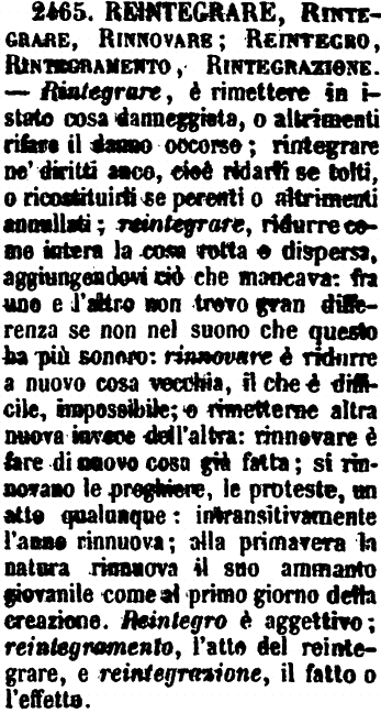 | Reintegrare, Rintegrare, Rinnovare; Reintegro, Rintegramento, Rintegrazione - Rintegrare, è rimettere in istato cosa danneggiata, o altrimenti rifare il danno occorso; rintegrare ne' diritti anco, cioè ridarli se tolti, o ricostituirli se perenti o altrimenti annullati; reintegrare, ridurre come intera la cosa rotta o dispersa, aggiungendovi ciò che mancava: fra uno e l'altro non trovo gran differenza se non nel suono che questo ha più sonoro: rinnovare è ridurre a nuovo cosa vecchia, il che è difficile, impossibile; e rimetterne altra nuova invece dell'altra: rinnovare è fare di nuovo cosa già fatta; si rinnovano le preghiere, le proteste, un atto qualunque: intransitivamente l'anno rinnuova; alla primavera la natura rinnuova il suo ammanto giovanile come al primo giorno della creazione. Reintegro è aggettivo; reintegramento, l'atto del reintegrare, e reintegrazione, il fatto o l'effetto. [immagine] |