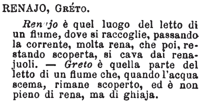 | Renajo, Greto - Renajo è quel luogo del letto di un fiume, dove si raccoglie, passando la corrente, molta rena, che poi, restando scoperta, si cava dai renajuoli. - Greto è quella parte del letto di un fiume che, quando l'acqua scema, rimane scoperto, ed è non pieno di rena, ma di ghiaja. [immagine] |