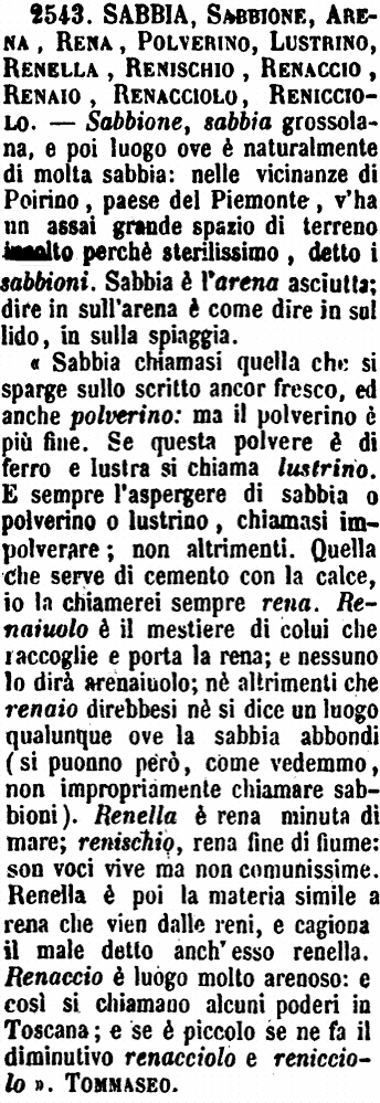 «Sabbia chiamasi quella che si sparge sullo scritto ancor fresco, ed anche polverino: ma il polverino è più fine. Se questa polvere è di ferro e lustra si chiama lustrino. E sempre l'aspergere di sabbia o polverino o lustrino, chiamasi impolverare; non altrimenti. Quella che serve di cemento con la calce, io la chiamerei sempre rena. Renaiuolo è il mestiere di colui che raccoglie e porta la rena; e nessuno lo dirà arenaiuolo; né altrimenti che renaio direbbesi né si dice un luogo qualunque ove la sabbia abbondi (si puonno però, come vedemmo, non impropriamente chiamare sabbioni). Renella è rena minuta di mare; renischio, rena fine di fiume: son voci vive ma non comunissime. Renella è poi la materia simile a rena che vien dalle reni, e cagiona il male detto anch'esso renella. Renaccio è luogo molto arenoso: e così si chiamano alcuni poderi in Toscana; e se è piccolo se ne fa il diminutivo renacciolo e renicciolo.» Tommaseo. [immagine] |