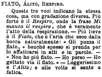 | Fiato, Alito, Respiro - Queste tre voci indicano la stessa cosa, ma con gradazione diversa. Più forte è il Respiro, onde la frase Mi manca il respiro, che è veramente l'atto della respirazione. - Più lieve è il Fiato, che è l'aria che esce dalla bocca naturalmente: «Gli puzza il fiato,» benchè spesso si prenda per lo affaticarsi in atti e in parole. - «Non ho più fiato. - Ho perso - Ho gettato via il fiato.» - Leggerissimo e l'Alito; e alle volte si sente a fatica. [immagine] |