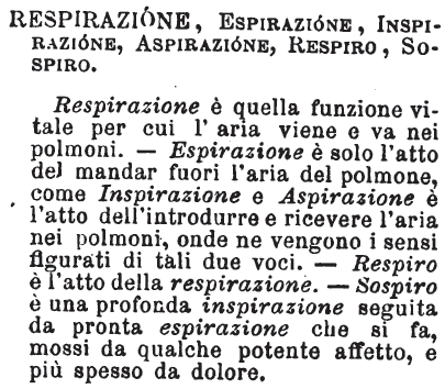 | Respirazione, Espirazione, Inspirazione, Aspirazione, Respiro, Sospiro - Respirazione è quella funzione vitale per cui l'aria viene e va nei polmoni. - Espirazione è solo l'atto del mandar fuori l'aria del polmone, come Inspirazione e Aspirazione è l'atto dell'introdurre e ricevere l'aria nei polmoni, onde ne vengono i sensi figurati di tali due voci. - Respiro è l'atto della Respirazione. - Sospiro è una profonda inspirazione seguita da pronta espirazione che si fa, mossi da qualche potente affetto, e più spesso da dolore. [immagine] |