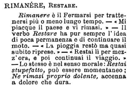 | Rimanere, Restare - Rimanere è il Fermarsi per trattenersi più o meno lungo tempo. - «Mi piacque il paese e vi rimasi.» - Il verbo Restare ha pur sempre l'idea di poca permanenza e di continuare il moto. - «La pioggia restò ma quasi subito riprese.» - «Restai lì per mezz'ora, e poi continuai il viaggio.» - Lo stesso è nel senso morale: Restai stupefatto, può essere momentaneo; Ne rimasi proprio dolente, accenna a dolore che dura. [immagine] |
