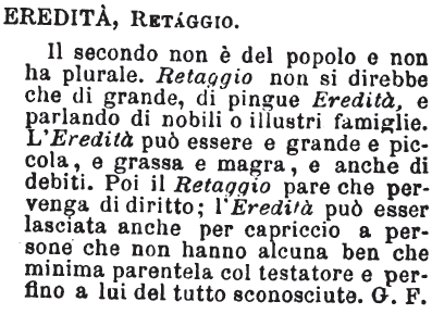 | Eredità, Retaggio - Il secondo non è del popolo e non ha plurale. Retaggio non si direbbe che di grande, di pingue Eredità, e parlando di nobili o illustri famiglie. L'Eredità può essere e grande e piccola, e grassa e magra, e anche di debiti. Poi il Retaggio pare che pervenga di diritto; l'Eredità può esser lasciata anche per capriccio a persone che non hanno alcuna ben che minima parentela col testatore e perfino a lui del tutto sconosciute. G. F. [immagine] |