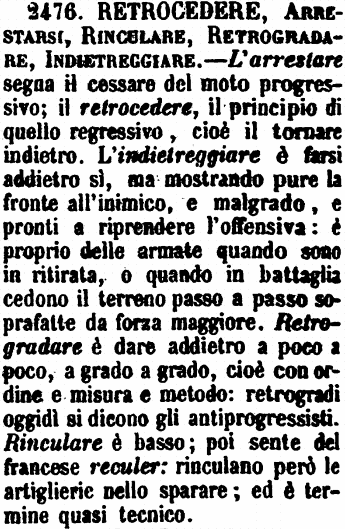 | Retrocedere, Arrestarsi, Rinculare, Retrogradare, Indietreggiare - L'arrestare segna il cessare del moto progressivo; il retrocedere, il principio di quello regressivo, cioè il tornare indietro. L'indietreggiare è farsi addietro sì, ma mostrando pure la fronte all'inimico, e malgrado, e pronti a riprendere l'offensiva: è proprio delle armate quando sono in ritirata, o quando in battaglia cedono il terreno passo a passo soprafatte da forza maggiore. Retrogradare è dare addietro a poco a poco, a grado a grado, cioè con ordine e misura e metodo: retrogradi oggidì si dicono gli antiprogressisti. Rinculare è basso; poi sente del francese reculer: rinculano però le artiglierie nello sparare; ed è termine quasi tecnico. [immagine] |