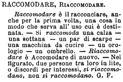 | Raccomodare, Riaccomodare - Raccomodare è il racconciare, anche per la prima volta, una cosa in modo che serva all'uso cui è destinata. - Si raccomoda una calza - una sottana - un par di scarpe - una macchina da cucire - un orologio - un ombrello. - Riaccomodare è Accomodare di nuovo. - Nel figurato, due persone tra loro in lite, o discordi per interessi, si riaccomodano, non si raccomodano. G. F. [immagine] |