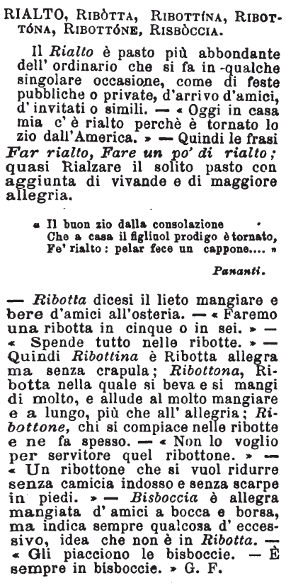 | Rialto, Ribotta, Ribottina, Ribottona, Ribottone, Risboccia - Il Rialto è pasto più abbondante dell'ordinario che si fa in qualche singolare occasione, come di feste pubbliche o private, d'arrivo d'amici, d'invitati o simili. - «Oggi in casa mia c'è rialto perchè è tornato lo zio dall'America.» - Quindi le frasi Far rialto, Fare un po' di rialto; quasi Rialzare il solito pasto con aggiunta di vivande e di maggiore allegria.