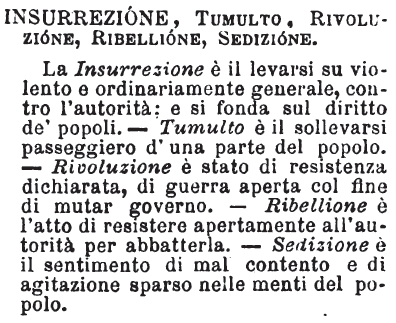 | Insurrezione, Tumulto, Rivoluzione, Ribellione, Sedizione - La Insurrezione è il levarsi su violento e ordinariamente generale, contro l'autorità: e si fonda sul diritto de' popoli. - Tumulto è il sollevarsi passeggiero d'una parte del popolo. - Rivoluzione è stato di resistenza dichiarata, di guerra aperta col fine di mutar governo. - Ribellione è l'atto di resistere apertamente all'autorità per abbatterla. - Sedizione è il sentimento di mal contento e di agitazione sparso nelle menti del popolo. [immagine] |