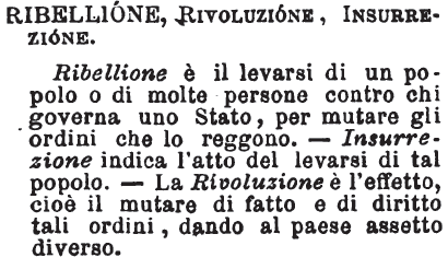 | Ribellione, Rivoluzione, Insurrezione - Ribellione è il levarsi di un popolo o di molte persone contro chi governa uno Stato, per mutare gli ordini che lo reggono. - Insurrezione indica l'atto del levarsi di tal popolo. - La Rivoluzione è l'effetto, cioè il mutare di fatto e di diritto tali ordini, dando al paese assetto diverso. [immagine] |