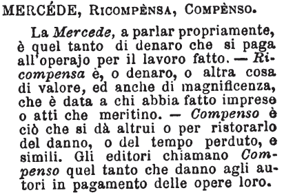 | Mercede, Ricompensa, Compenso - La Mercede, a parlar propriamente, è quel tanto di denaro che si paga all'operajo per il lavoro fatto. - Ricompensa è, o denaro, o altra cosa di valore, ed anche di magnificenza, che è data a chi abbia fatto imprese o atti che meritino. - Compenso è ciò che si dà altrui o per ristorarlo del danno, o del tempo perduto, e simili. Gli editori chiamano Compenso quel tanto che danno agli autori in pagamento delle opere loro. [immagine] |