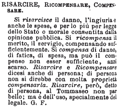 | Risarcire, Ricompensare, Compensare - Si risarcisce il danno, l'ingiuria e anche le spese, e per lo più per legge dello Stato o morale consentita dalla opinione pubblica. Si ricompensa il merito, il servigio, compensando sufficientemente. Si compensa di danno, di fatica, di spesa, ma può il compenso non esser sufficiente, anzi scarso. Risarcire e Ricompensare dicesi anche di persona; di persona non si direbbe con molta proprietà compensarla. Risarcire, però, detto di persona, al Tommaseo non par bello; ma è dell'uso, specialmente del legale. G. F. [immagine] |