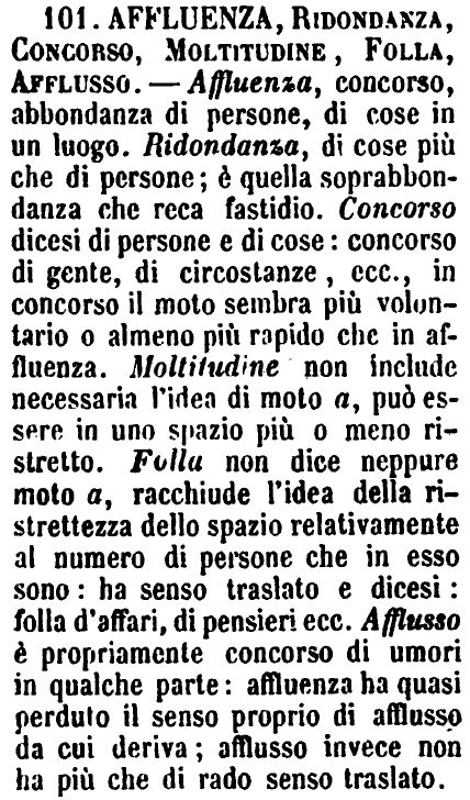 | Affluenza, Ridondanza, Concorso, Moltitudine, Folla, Afflusso - Affluenza, concorso, abbondanza di persone, di cose in un luogo. Ridondanza, di cose più che di persone; è quella soprabbondanza che reca fastidio. Concorso dicesi di persone e di cose: concorso di gente, di circostanze, ecc., in concorso il moto sembra più volontario o almeno più rapido che in affluenza. Moltitudine non include necessaria l'idea di moto a, può essere in uno spazio più o meno ristretto. Folla non dice neppure moto a, racchiude l'idea della ristrettezza dello spazio relativamente al numero di persone che in esso sono: ha senso traslato e dicesi: folla d'affari, di pensieri ecc. Afflusso è propriamente concorso di umori in qualche parte: affluenza ha quasi perduto il senso proprio di afflusso da cui deriva; afflusso invece non ha più che di rado senso traslato. [immagine] |