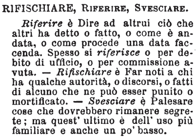 | Rifischiare, Riferire, Svesciare - Riferire è Dire ad altrui ciò che altri ha detto o fatto, o come è andata, o come procede una data faccenda. Spesso si riferisce o per debito di ufficio, o per commissione avuta. - Rifischiare è Far noti a chi ha qualche autorità, o discorsi, o fatti di alcuno che ne può esser punito o mortificato. - Svesciare è Palesare cose che dovrebbero rimanere segrete; ma quest'ultimo è dell'uso più familiare e anche un po' basso. [immagine] |