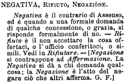| Negativo, Rifiuto, Negazione - Negativa è il contrario di Assenso, ed è quando a una formale domanda di qualche concessione, o grazia, si risponde formalmente di no. - Rifiuto è il non accettare la cosa offertaci, o l'ufficio conferitoci, o simili. Vedi in Rifiutare. - [Negazione si contrappone ad Affermazione. La Negativa si dà a chi domanda qualcosa; La Negazione è l'atto del negare ciò che altri afferma. G. F.] [immagine] |