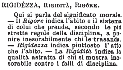 | Rigidezza, Rigidità, Rigore - Qui si parla del significato morale. - Il Rigore indica l'abito e il sistema di colui che prende, secondo le più strette regole della disciplina, a punire inesorabilmente chi le trasanda. - Rigidezza indica piuttosto l'atto che l'abito. - La Rigidità indica la qualità astratta di chi si mostra inesorabile contro i falli di disciplina. [immagine] |