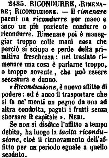 « Riconduzione, è nuovo affitto di podere: ed è anco il trasportare che si fa ne' monti un pegno da una ad altra condotta, pagati i frutti senza sborsare il capitale ». Neri. Se non si disdice l'affitto a tempo debito, ha luogo la tacita riconduzione, cioè il rinnovamento dell'affitto per un periodo eguale a quello scaduto. [immagine] |