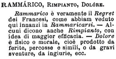 | Rammarico, Rimpianto, Dolore - Rammarico è veramente il Regret dei Francesi, come abbiam veduto qui innanzi in Rammaricarsi.