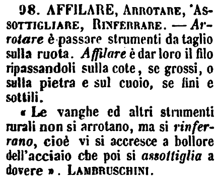 | Affilare, Arrotare, Assottigliare, Rinferrare - Arrotare è passare strumenti da taglio sulla ruota. Affilare è dal loro il filo ripassandoli sulla cote, se grossi, o sulla pietra e sul cuoio, se fini e sottili.