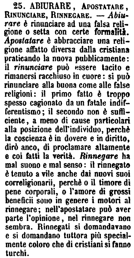 | Rinunziare, Rinnegare, Abjurare - Rinunziare è l'acconciarsi a non usar più una cosa, a non farla più. - Rinnegare si dice di una religione che altri abbandona per seguirne una altra, o anche abbandonare né riconoscere per tale, il maestro, la famiglia, i genitori. - Abjurare è Abbandonare e disconoscere pubblicamente un errore pubblicamente professato o in religione o in filosofia. [immagine] |