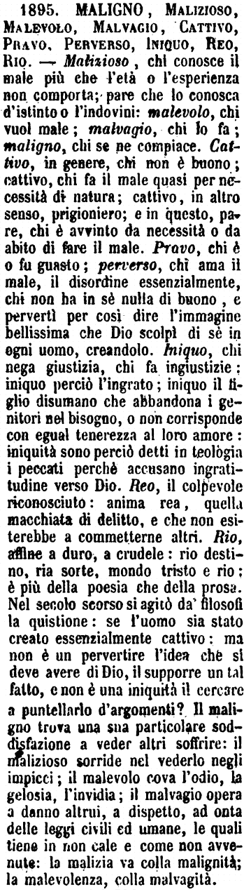 | Maligno, Malizioso, Malevolo, Malvagio, Cattivo, Pravo, Perverso, Iniquo, Reo, Rio - Malizioso, chi conosce il male più che l'età o l'esperienza non comporta; pare che lo conosca d'istinto o l'indovini: malevolo, chi vuol male; malvagio, chi lo fa; maligno, chi se ne compiace. Cattivo, in genere, chi non è buono; cattivo, chi fa il male quasi per necessità di natura; cattivo, in altro senso, prigioniero; e in questo, pare, chi è avvinto da necessità o da abito di fare il male. Pravo, chi è o fu guasto; perverso, chi ama il male, il disordine essenzialmente, chi non ha in sè nulla di buono, e pervertì per così dire l'immagine bellissima che Dio scolpì di sè in ogni uomo, creandolo. Iniquo, chi nega giustizia, chi fa ingiustizie: iniquo perciò l'ingrato; iniquo il figlio disumano che abbandona i genitori nel bisogno, o non corrisponde con egual tenerezza al loro amore: iniquità sono perciò detti in teologia i peccati perché accusano ingratitudine verso Dio. Reo, il colpevole riconosciuto: anima rea, quella macchiata di delitto, e che non esiterebbe a commetterne altri. Rio, affine a duro, a crudele: rio destino, ria sorte, mondo tristo e rio; è più della poesia che della prosa. Nel secolo scorso si agitò da' filosofi la quistione: se l'uomo sia stato creato essenzialmente cattivo: ma non è un pervertire l'idea che si deve avere di Dio, il supporre un tal fatto, e non è una iniquità il cercare a puntellarlo d'argomenti? Il maligno trova una sua particolare soddisfazione a veder altri soffrire: il malizioso sorride nel vederlo negli impicci; il malevolo cova l'odio, la gelosia, l'invidia; il malvagio opera a danno altrui, a dispetto, ad onta delle leggi civili ed umane, le quali tiene in non cale e come non avvenute: la malizia va colla malignità; la malevolenza, colla malvagità. [immagine] |