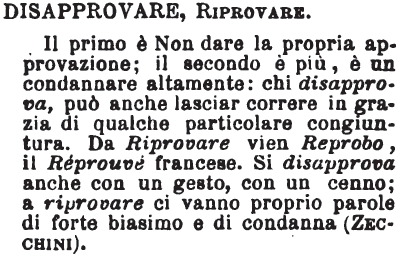 | Disapprovare, Riprovare - Il primo è Non dare la propria approvazione; il secondo è più, è un condannare altamente: chi disapprova, può anche lasciar correre in grazia di qualche particolare congiuntura. Da Riprovare vien Reprobo, il Réprouvé francese. Si disapprova anche con un gesto, con un cenno; a riprovare ci vanno proprio parole di forte biasimo e di condanna (Zecchini). [immagine] |