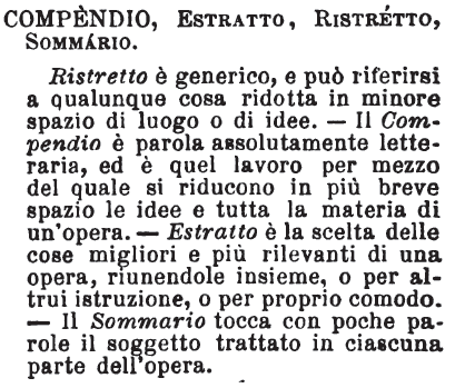 | Compendio, Estratto, Ristretto, Sommario - Ristretto è generico, e può riferirsi a qualunque cosa ridotta in minore spazio di luogo o di ide. - Il Compendio è parola assolutamente letteraria, ed è quel lavoro per mezzo del quale si riducono in più breve spazio le idee e tutta la materia di un'opera. - Estratto è la scelta delle cose migliori e più rilevanti di una opera, riunendole insieme, o per altrui istruzione, o per proprio comodo. - Il Sommario tocca con poche parole il soggetto trattato in ciascuna parte dell'opera. [immagine] |