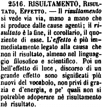 | Risultamento, Risultato, Effetto - Il risultamento si vede via via, mano a mano che si produce dalle cause agenti; il risultato è la fine, il corollario, il quoziente di esse. L'effetto è più immediatamente legato alla causa che non il risultato, almeno nel linguaggio filosofico e scientifico. Poi un bell'effetto di luce, discorso di un grande effetto sono significati più nuovi del vocabolo, non privi di grazia e d'energia, e pe' quali non si potrebbe adoperare nè risultamento nè risultato. [immagine] |