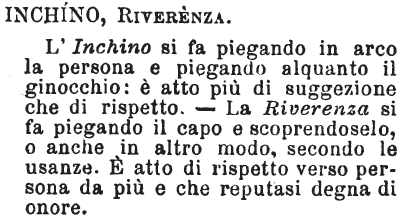 | Inchino, Riverenza - L'Inchino si fa piegando in arco la persona e piegando alquanto il ginocchio: è atto più di suggezione che di rispetto. - La Riverenza si fa piegando il capo e scoprendoselo, o anche in altro modo, secondo le usanze. E' atto di rispetto verso persona da più e che reputasi degna di onore. [immagine] |