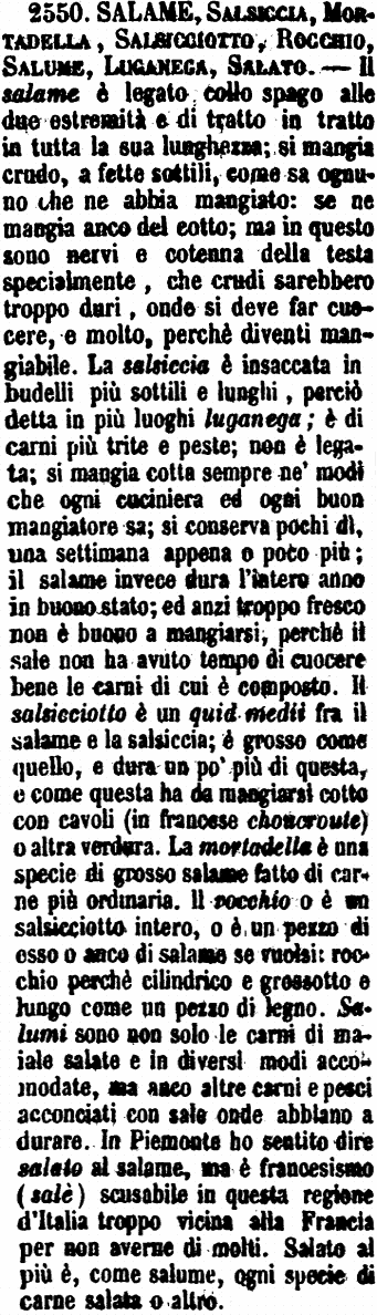| Salame, Salsiccia, Mortadella, Salsicciotto, Rocchio, Salume, Luganega, Salato - Il salame è legato collo spago alle due estremità e di tratto in tratto in tutta la sua lunghezza; si mangia crudo, a fette sottili, come sa ognuno che ne abbia mangiato: se ne mangia anco del cotto; ma in questo sono nervi e cotenna della testa specialmente, che crudi sarebbero troppo duri, onde si deve far cuocere, e molto, perchè diventi mangiabile. La salsiccia è insaccata in budelli più sottili e lunghi, perciò detta in più luoghi luganega; è di carni più trite e peste; non è legata; si mangia cotta sempre ne' modi che ogni cuciniera ed ogni buon mangiatore sa; si conserva pochi dì, una settimana appena o poco più; il salame invece dura l'intero anno in buono stato; ed anzi troppo fresco non è buono a mangiarsi, perchè il sale non ha avuto tempo di cuocere bene le carni di cui è composto. Il salsicciotto è un quid medii fra il salame e la salsiccia; è grosso come quello, e dura un po' più di questa, e come questa ha da mangiarsi cotto con cavoli (in francese choucroute) o altra verdura. La mortadella è una specie di grosso salame fatto di carne più ordinaria. Il rocchio o è un salsicciotto intero, o è un pezzo di esso o anco di salame se vuolsi: rocchio perchè cilindrico e grossotto e lungo come un pezzo di legno. Salumi sono non solo le carni di maiale salate e in diversi modi accomodate, ma anco altre carni e pesci acconciati con sale onde abbiano a durare. In Piemonte ho sentito dire salato al salame, ma è francesismo (salè) scusabile in questa regione d'Italia troppo vicina alla Francia per non averne di molti. Salato al più è, come salume, ogni specie di carne salata o altro. [immagine] |