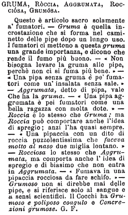 | Gruma, Roccia, Aggrumata, Rocciosa, Grumosa - Questo è articolo sacro solamente a' fumatori. - Gruma è quella incrostazione che si forma nel caminetto delle pipe dopo un lungo uso. I fumatori ci mettono a questa gruma una grande importanza, e dicono che rende il fumo più buono. - «Non bisogna levare la gruma alle pipe, perché non ci si fuma più bene.» -«Una pipa senza gruma è pe' fumatori come un'insalata senza sale.» - Aggrumata, detto di pipa, vale Che ha la gruma. - «Una pipa aggrumata è pei fumatori come una bella ragazza con molta dote.» - Roccia è lo stesso che Gruma; ma Roccia può comportare anche l'idea di spregio; anzi l'ha quasi sempre. - «Una pipaccia con un dito di roccia puzzolentissima che faceva motto al naso due miglia lontano.» - Rocciosa lo stesso che Aggrumata, ma comporta anche l'idea di spregio e di biasimo che non entra in Aggrumata. - «Fumava in una pipaccia rocciosa da fare schifo.» - Grumoso non si direbbe mai delle pipe, e si riferisce solo al sangue e a sensi scientifici. Il Cocchi ha Grumoso e poliposo coagulo e Concrezioni grumose. G.F. [immagine] |