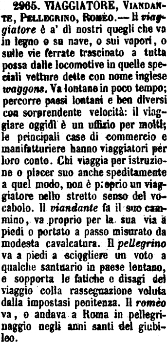 | Viaggiatore, Viandante, Pellegrino, Romeo - Il viaggiatore è a' dì nostri quegli che va in legno o su nave, o sui vapori, o sulle vie ferrate trascinato a tutta possa dalle locomotive in quelle speciali vetture dette con nome inglese waggons. Va lontano in poco tempo; percorre paesi lontani e ben diversi con sorprendente velocità: il viaggiare oggidì è un uffizio per molti; le principali case di commercio e manifatturiere hanno viaggiatori per loro conto. Chi viaggia per istruzione o piacer suo anche speditamente a quel modo, non è proprio un viaggiatore nello stretto senso del vocabolo. Il viandante fa il suo cammino, va proprio per la sua via a piedi o portato a passo misurato da modesta cavalcatura. Il pellegrino va a piedi a sciogliere un voto a qualche santuario in paese lontano, e sopporta le fatiche e disagi del viaggio colla rassegnazione voluta dalla impostasi penitenza. Il romèo va, o andava a Roma in pellegrinaggio negli anni santi del giubileo. [immagine] |