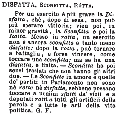 | Disfatta, Sconfitta, Rotta - Per un esercito è più grave la Disfatta, chè, dopo di essa, non può più sperare vittoria; vien poi, in minor gravità, la Sconfitta e poi la Rotta. Messo in rotta, un esercito non è ancora sconfitto e tanto meno disfatto; dopo la rotta, può tornare a battaglia, e forse vincere, come toccare una sconfitta; ma se ha una disfatta, è finita. - Sconfitta ha poi sensi traslati che non hanno gli altri due. - Le Sconfitte in amore e quelle de' partiti in Parlamento non sono nè rotte nè disfatte, sebbene possano toccare a uomini sfatti da' vizii e a depotati rotti a tutti gli artificii della parola e a tutte le arti della vita politica. G. F. [immagine] |