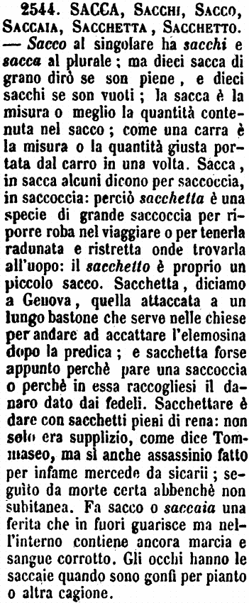 | Sacca, Sacchi, Sacco, Saccaia, Sacchetta, Sacchetto - Sacco al singolare ha sacchi e sacca al plurale; ma dieci sacca di grano dirò se son piene, e dieci sacchi se son vuoti; la sacca è la misura o meglio la quantità contenuta nel sacco; come una carra è la misura o la quantità giusta portata dal carro in una volta. Sacca, in sacca alcuni dicono per saccoccia, in saccoccia: perciò sacchetta è una specie di grande saccoccia per riporre roba nel viaggiare o per tenerla radunata e ristretta onde trovarla all'uopo: il sacchetto è proprio un piccolo sacco. Sacchetta, diciamo a Genova, quella attaccata a un lungo bastone che serve nelle chiese per andare ad accattare l'elemosina dopo la predica; e sacchetta forse appunto perchè pare una saccoccia o perchè in essa raccogliesi il danaro dato dai fedeli. Sacchettare è dare con sacchetti pieni di rena: non solo era supplizio, come dice Tommaseo, ma sì anche assassinio fatto per infame mercede da sicarii; seguìto da morte certa abbenchè non subitanea. Fa sacco o saccaia una ferita che in fuori guarisce ma nell'interno contiene ancora marcia e sangue corrotto. Gli occhi hanno le saccaie quando sono gonfi per pianto o altra cagione. [immagine] |