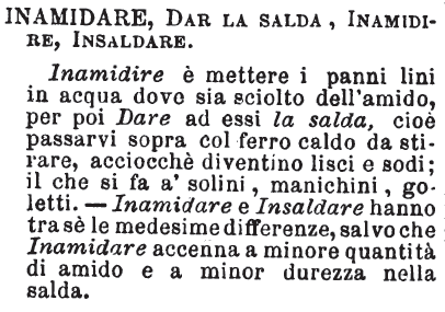 | Inamidare, Dar la salda, Inamidire, Insaldare - Inamidire è mettere i panni lini in acqua dove sia sciolto dell'amido, per poi Dare ad essi la salda, cioè passarvi sopra col ferro caldo da stirare, acciocchè diventino lisci e sodi; il che si fa a' solini, manichini, goletti. - Inamidare e Insaldare hanno tra sè le medesime differenze, salvo che Inamidare accenna a minor quantità di amido e a minor durezza nella salda. [immagine] |