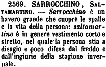 | Sarrocchino, Saltamartino - Sarrocchino è un bavero grande che cuopre le spalle e la vita della persona: saltamartino è in genere vestimento corto e stretto, nel quale la persona stia a disagio e poco difesa dal freddo e dall'ingiurie della stagione invernale. [immagine] |