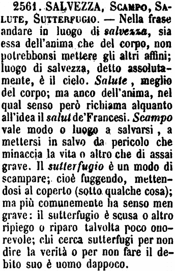| Salvezza, Scampo, Salute, Sutterfugio - Nella frase andare in luogo di salvezza, sia essa dell'anima che del corpo, non potrebbonsi mettere gli altri affini; luogo di salvezza, detto assolutamente, è il cielo. Salute, meglio del corpo: ma anco dell'anima, nel qual senso però richiama alquanto all'idea il salut de' Francesi. Scampo vale modo o luogo a salvarsi, a mettersi in salvo da pericolo che minaccia la vita o altro che di assai grave. Il sutterfugio è un modo di scampare; cioè fuggendo, mettendosi al coperto (sotto qualche cosa); ma più comunemente ha senso men grave: il sutterfugio è scusa o altro ripiego o riparo talvolta poco onorevole; chi cerca sutterfugi per non dire la verità o per non fare il debito suo è uomo dappoco. [immagine] |