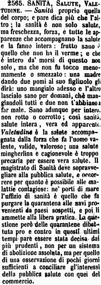 | Sanità, Salute, Valetudine - Sanità proprio quella del corpo; e pare dica più che l'altro; la sanità è non solo salute, ma freschezza, forza, e tutte le apparenze che accompagnano la salute e la fanno intera: frutto sano è quello che non ha il verme; e che è intero da' morsi di questo non solo, ma che non fu tocco menomamente o smezzato: una madre dando due pomi al suo figliuolo gli dirà: uno mangialo adesso e l'altro lascialo sano per domani, chè mangiandoli tutti e due non t'abbiano a far male. Sano adunque per intero, non rotto o corrotto; così sanità, salute intera, vera ed apparente. Valetudine è la salute accompagnata dalla forza che fa l'uomo valente, valido, valoroso; una salute mingherlina e cagionevole è troppo precaria per essere vera salute. Il magistrato di Sanità deve sopravvegliare alla pubblica salute, e occorrere per quanto è possibile alle malattie contagiose: ne' porti di mare l'uffizio di sanità è quello che fa purgare la quarantena alle navi provenienti da paesi sospetti, e poi li ammette alla libera pratica. La questione però delle quarantene dibattuta pro e contro in questi ultimi tempi pare essere stata decisa dai più prudenti, non per un sistema di abolizione assoluta, ma per quello di una osservazione di pochi giorni sufficienti a conciliare gl'interessi della pubblica salute con quei del commercio. [immagine] |