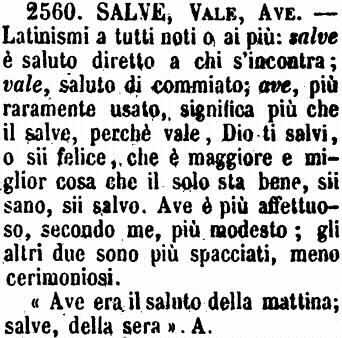 | Salve, Vale, Ave - Latinismi a tutti noti o ai più: salve è saluto diretto a chi s'incontra; vale, saluto di commiato; ave, più raramente usato, significa più che il salve, perché vale, Dio ti salvi, o sii felice, che è maggiore e miglior cosa che il solo sta bene, sii sano, sii salvo. Ave è più affettuoso, secondo me, più modesto; gli altri due sono più spacciati, meno cerimoniosi.