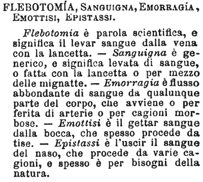 | Flebotomia, Sanguigna, Emorragia, Emottisi, Epistassi - Flebotomia è parola scientifica, e significa il levar sangue dalla vena con la lancetta. - Sanguigna è generico, e significa levata di sangue, o fatta con la lancetta o per mezzo delle mignatte. - Emorragia è flusso abbondante di sangue da qualunque parte del corpo, che avviene o per ferita di arterie o per cagioni morbose. - Emottisi è il gettar sangue dalla bocca, che spesso procede da tise. - Epistassi è l'uscir il sangue del naso, che procede da varie cagioni, e spesso è per bisogni della natura. [immagine] |